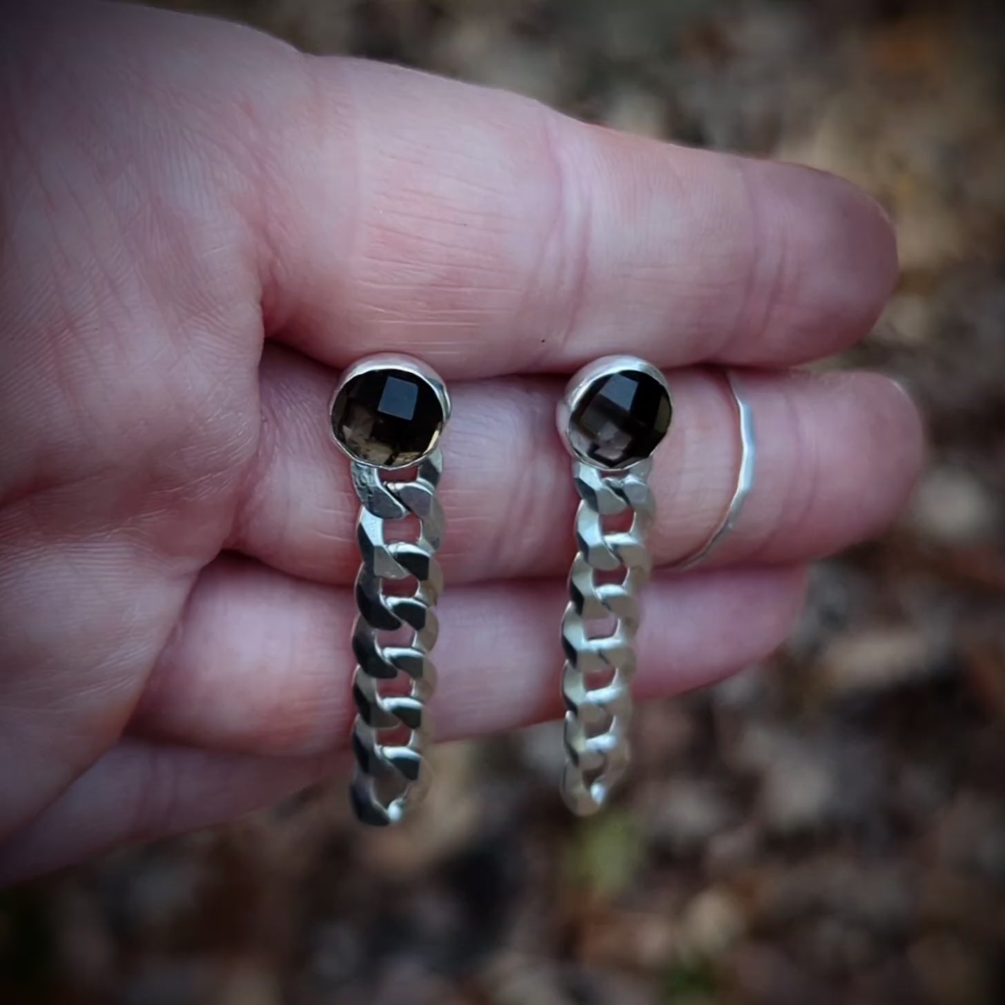 Smokey Quartz set in fine and sterling silver. Length with chain 1.5". Earrings are stud backed and weigh less than 1 gram per earring.